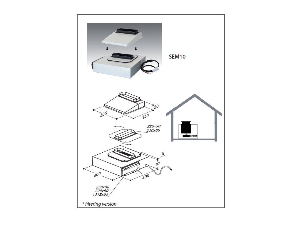 Motorová jednotka digestoře (odsavače par) se instaluje do soklu ve spodní části kuchyňské linky. Tato motorová jednotka je ideální pro recirkulační režim digestoře (odsavače par)